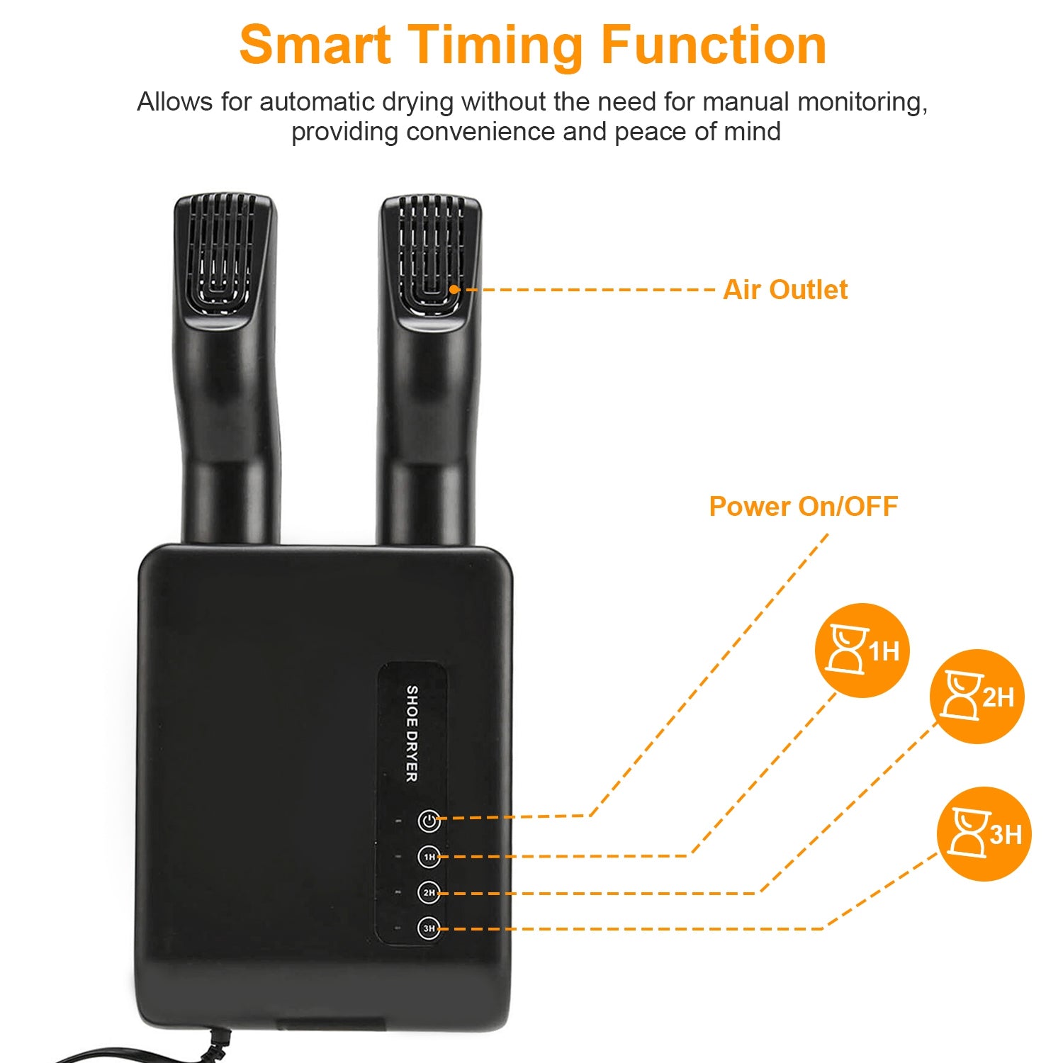 - *Smart Timing Function*: Equipped with 1H/2H/3H timer settings,our shoe dryer allows for automatic drying without the need for manual monitoring,providing convenience and peace of mind.